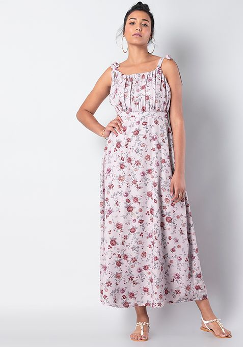 Flowy and feminine, this beige maxi dress is perfect for long sunny days. Tailored in pretty florals, it features tie-up straps.