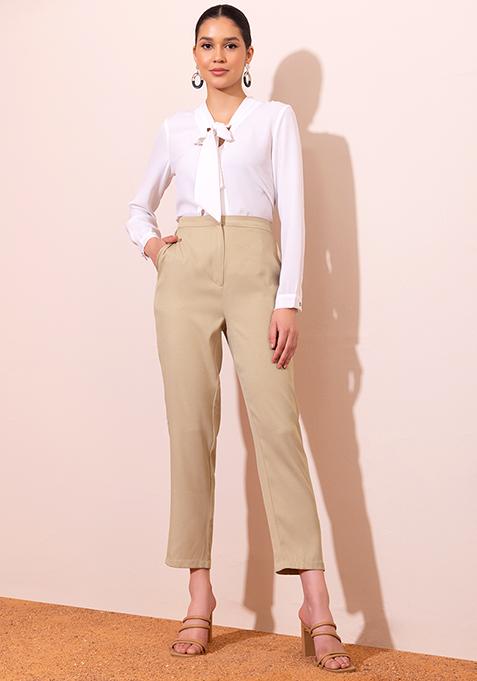 Beige High Waist Tapered Trousers