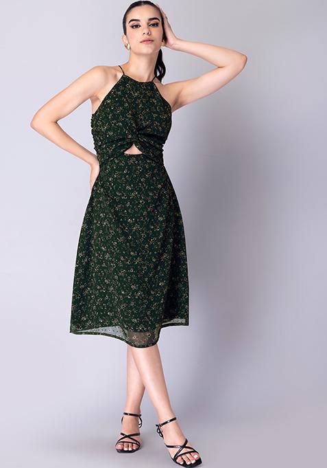 Dark Green Floral Halter Midi Dress