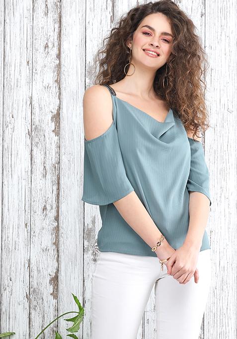 Season your evening look with a dash of glam with this grey embellished top. It features a cold shoulder design with embellished straps and a romantic cowl neck .