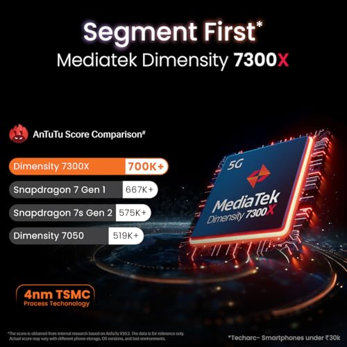 - Impeccable Performance & Thermal Management: Segment’s 1st powerful Dimensity 7300X processor, LPDDR5 RAM & UFS3.1 Storage with Large Vapour Chamber Cooling Technology
