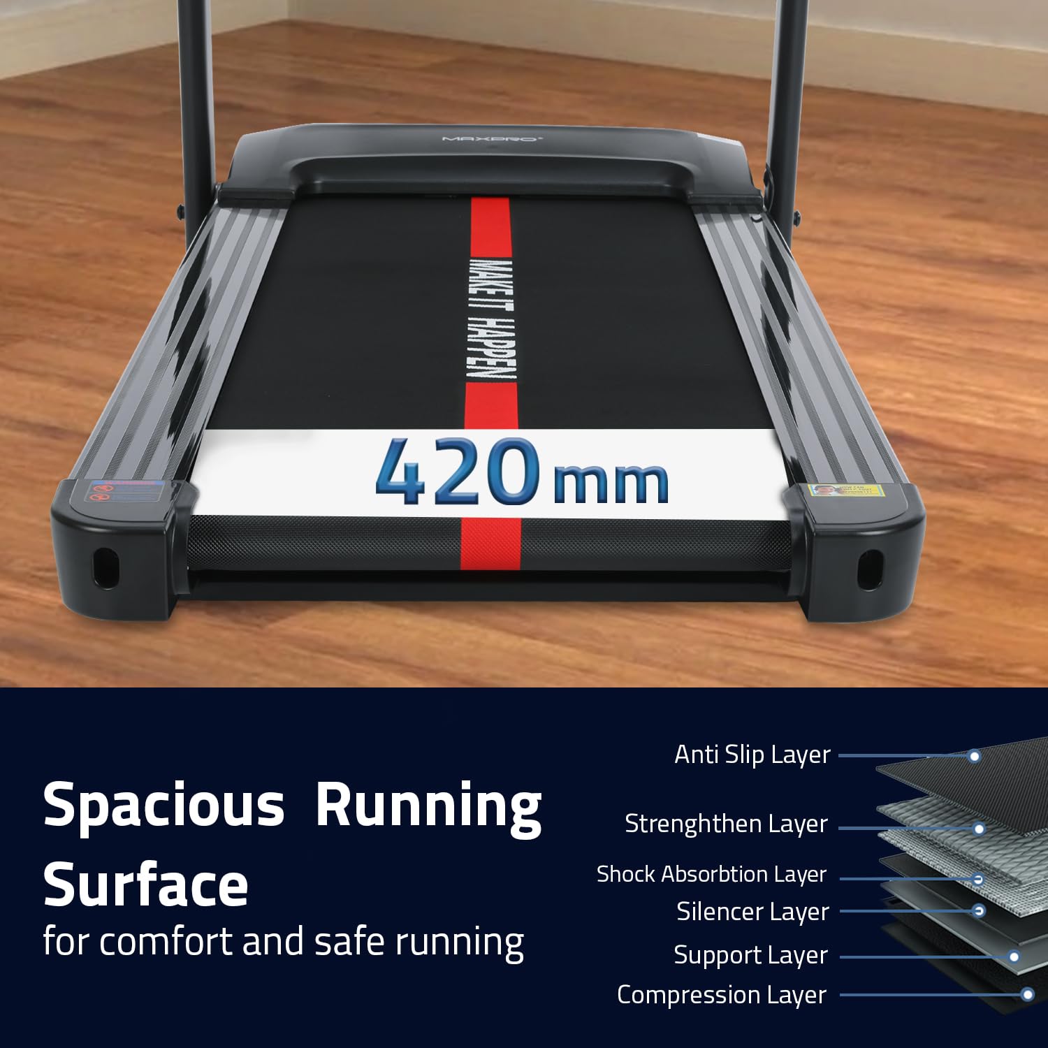 - 【Features】- Mobile & tablet holder for safe keeping your smart devices while running. Easily foldable using soft drop hydraulic system. Running surface (L x W) – 1150 X 420mm . The multi-layered running belt reduces sudden shocks. The textured material offers optimum traction and makes it easy to use without compromising on its functionality.