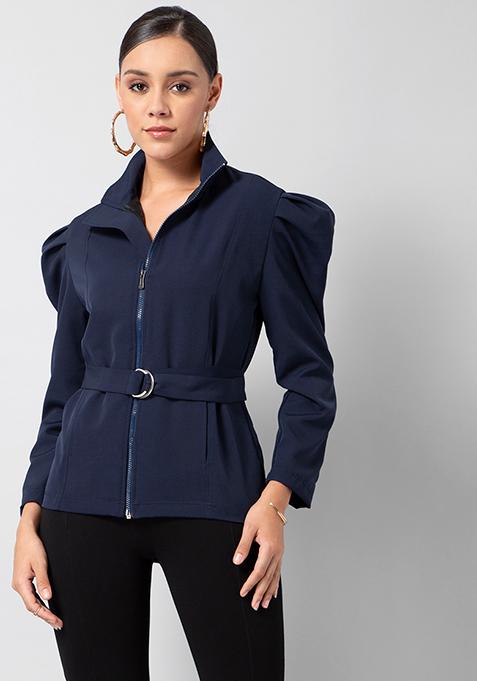 Navy Power Shoulder Belted Zipper Jacket