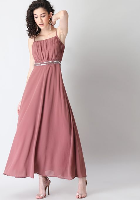 Glam up for a night of drinks and dinner in this rusty rose embellished waist maxi dress. Tailored sleeveless, the dress features a crushed detail on the bodice.