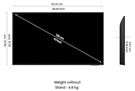 Screen Size 43 Inches Brand Samsung Display Technology UHD Resolution 4K Refresh Rate 50 Hz Special Feature Crystal Processor 4K | 4K Upscaling | UHD Dimming | Motion Xcelerator Included Components 1 Unit TV, 1 Remote Control, 1 User Manual, 1 Power Cable Connectivity Technology Wi-Fi, USB, Ethernet, HDMI Aspect Ratio 16:9 Product Dimensions 6D x 96.8W x 56.1H Centimeters