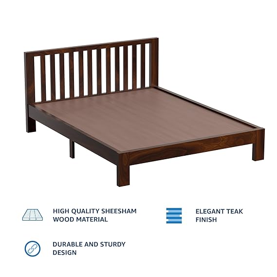 - Material: Sheesham Solid Wood with a premium teak finish. Mattress support is MDF board