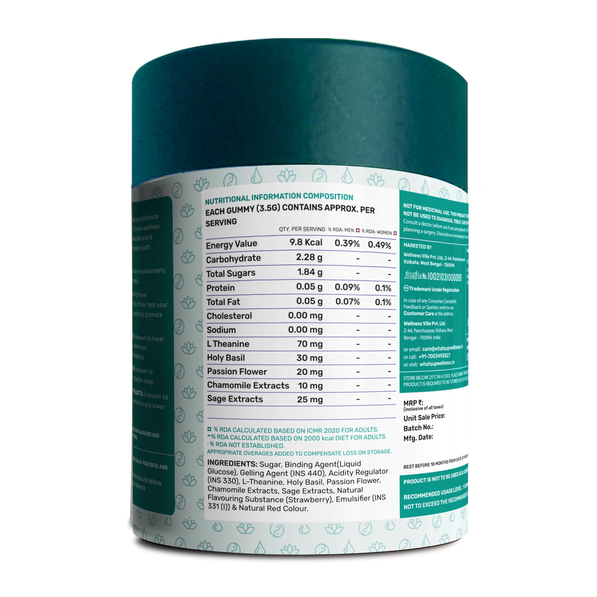 - What’s Up STRESS & ANXIETY RELIEF GUMMY: Calm your mind and counter bad vibes with the help of our strawberry flavored mood boost gummy supplements. This stress relief zen blend uses L-Theanine, Holy Basil,Chamomile, Passion Flower and Sage Extracts to help you stay calm, cool, and collected.