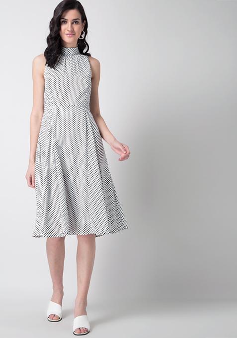 Make a statement while keeping it minimal with this chic white halter dress. Tailored in peppy polkas, it features a back tie and a godet detail.