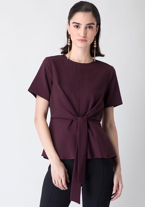 Shift from noon to night in style with this winning wine blouse. Featuring a classic round neck, it comes with a front knot to elevate the look.